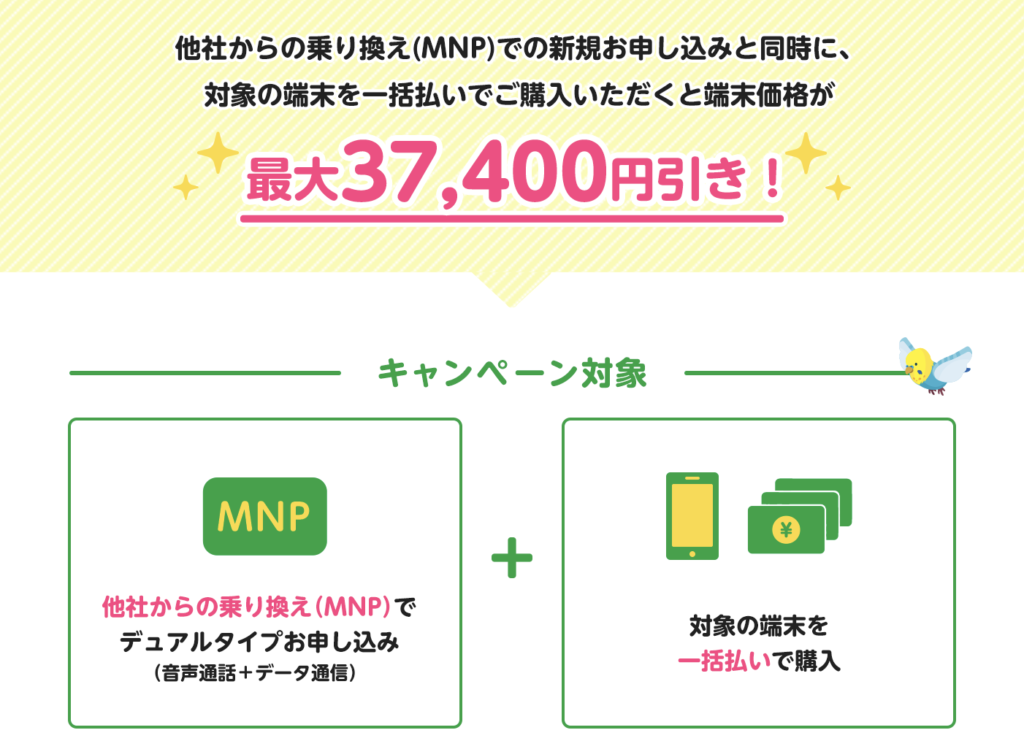 他社から乗り換え(MNP)で新しく申し込み、対象スマホを一括払いで購入すると、最大37,400円の値引きが適用されます。